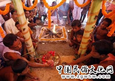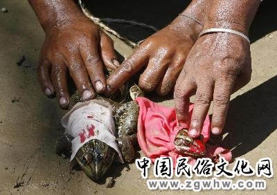 中国日报网环球在线消息:为祈雨缓解当地干旱缺水的局面,印度西孟加拉邦的一个村庄上周为两只青蛙举行了盛大的“结婚仪式”,3000人参加了这场婚礼。